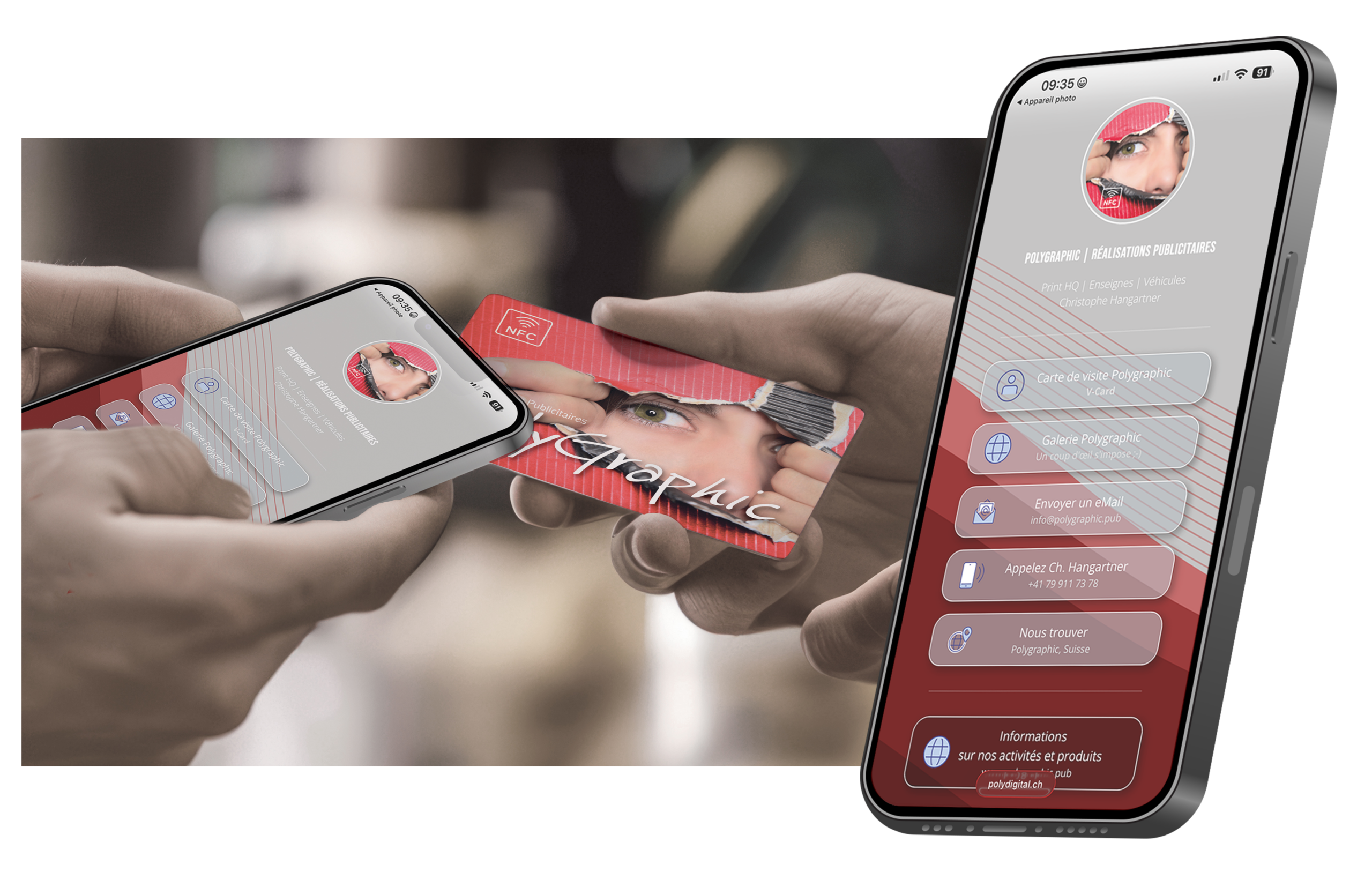 Polydigital.ch propose des cartes de visite numériques basées sur la technologie NFC (Near Field Communication). Le concept permet aux utilisateurs de partager leurs informations de contact en approchant simplement la carte de leur interlocuteur d’un smartphone compatible NFC.
